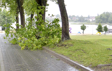 Gdy pisaliśmy to co powyżej, nie zdawaliśmy sobie sprawy z kruchości konarów drzew rosnących od strony zabytkowych murów zamkowych. Tymczasem po parnym początku dnia, w miniony czwartek, nad miasto nadciągnęły czarne chmury i rozpętała się nawałnica. Nie było nawet silnego wiatru, ale spadła tak obfita ulewa, że jej naporu nie wytrzymywały co słabsze drzewa lub ich konary. Właśnie niedługo po tym, jak z miejskiej plaży w wielkim pośpiechu ewakuowali się kąpielowicze, z jednego z drzew stojących przy ul. Spacerowej oberwała się całkiem spora gałąź, spadając wprost na chodnik.