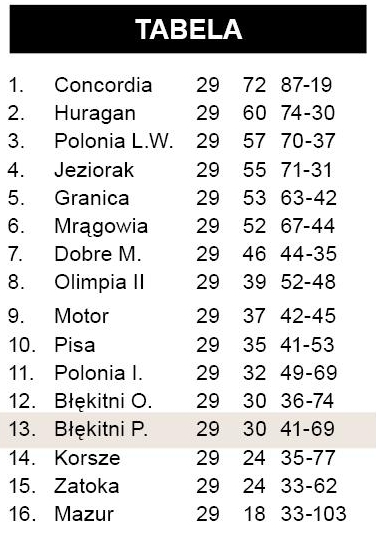 W ostatnich dniach czasie Huragan był postrzegany jako jeden z zastępczych kandydatów do awansu do III ligi – powodem były zaległości finansowe Concordii, która już wcześniej wywalczyła tytuł mistrzowski. FIFA zagroziła elblążanom odebraniem aż 12 punktów za nieterminowe rozliczenie się z grającymi tam piłkarzami z Hiszpanii. Wtedy do wyższej klasy wróciłby zespół z Morąga. Przed meczem rozstrzygnięcie nie było jeszcze znane – tak czy owak Błękitni jechali do jaskini lwa. Ich ostatni nie najlepszy występ przeciwko drużynie z Ornety był najwyraźniej bodźcem do bardziej uważnej gry. Choć spotkanie w Morągu nie było pojedynkiem pucharowym, niemal o wszystkim zdecydowały rzuty karne. Arbiter aż trzy razy wskazywał na wapno – i egzekutorzy nie mylili się. Dwukrotnie w ten sposób został pokonany Brzozowski, po stronie pasymskiej swoją robotę wykonał Malanowski. Najlepszy w tej chwili strzelec IV ligi pod koniec meczu celnie uderzył także z dystansu i zapewnił swojej drużynie punkt. {akeebasubs !*}