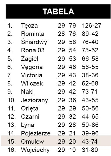 Omulew wygrała poprzednio 10 kwietnia i dopiero teraz przerwała fatalną serię, podczas której wywalczyła jedynie oczko. Łyna przyjechała do Wielbarka w nie najmocniejszym składzie, co powinno zdopingować miejscowych do powalczenia o komplet punktów.