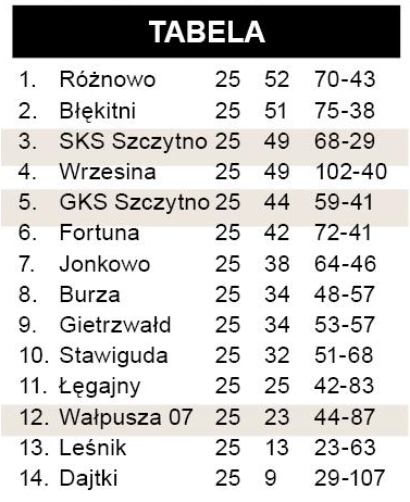 Niemal od samego początku przewaga fizyczna i techniczna była po stronie gospodarzy, którzy przed przerwą wyszli na dwubramkowe prowadzenie. 2:0 to wynik nie do końca bezpieczny, o czym szczytnianie przekonali się tydzień wcześniej. W sobotnie popołudnie było jednak inaczej. Tuż po zmianie stron bramkarza Fortuny ubiegł Kozicki, a ozdobą meczu był gol Manowskiego, który silnie i celnie uderzył zza linii pola karnego. Przyjezdni odpowiedzieli tylko bramką z rzutu karnego, podyktowanego za dość przypadkowe zagranie ręką. SKS powinien teraz rozprawić się na wyjeździe z GLKS-em Jonkowo i kibicować jednocześnie GKS-owi, który zagra u siebie z LKS-em Różnowo. Można także liczyć na potknięcie Błękitnych Stary Olsztyn w meczu z przedostatnim Leśnikiem. Bezpośrednio awansuje mistrz, druga drużyna zagra baraż z jednym z zespołów klasy okręgowej.