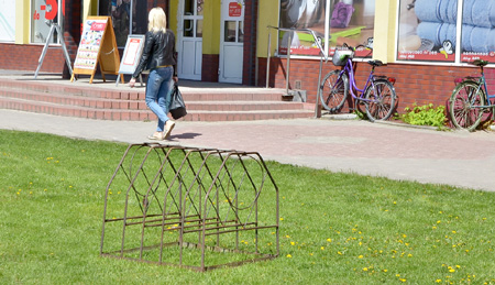 Gdy tak spacerowaliśmy ulicami miasta, zauważyliśmy też, że pod jednym z większych sklepów postawiono dla klientów stojak na rowery, choć trzeba dodać, że mocno zardzewiały. Jak domyślamy się, temu kto go stawiał, chodziło o to, by klienci nie opierali rowerów o ściany domu handlowego, co mogłoby się skończyć ich zarysowaniem albo jeszcze większymi zniszczeniami. Cóż, stojak umieszczono dość nieszczęśliwie, bo na środku... trawnika. Aby z niego skorzystać, trzeba by podeptać trawę. Tymczasem rowerzyści okazali się zdyscyplinowani i szanują zieleń.
