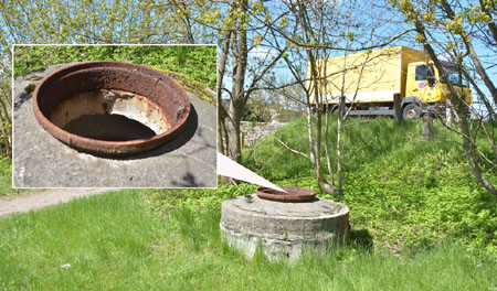 Gdy już wyjdziemy z lasku od strony ul. Podleśnej, zauważymy tuż pod nieczynnym torowiskiem wiodącym do Biskupca studzienkę kanalizacyjną. Ktoś zsunął z niej pokrywę i teraz pozostaje otwarta, niczym niezabezpieczona.