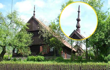 W innym miejscu miasta, przy ul. Konopnickiej stoi zabytkowa, ciekawa chata mazurska. Piecze nad obiektem sprawuje Towarzystwo Przyjaciół Szczytna, urządzając tam od czasu do czasu interesujące imprezy, ale dziś nie o tym, a o architektonicznych detalach. Przed chatą stoi tablica informacyjna (na zdjęciu), jednak jej stan pozostawia wiele do życzenia. Jest brudna i fragmentami mało czytelna, a przede wszystkim jej zdjęcie główne. Należałoby ją wypucować, bo sezon turystyczny tuż - tuż. Poza tym, od strony ulicy chata utraciła część ozdobnego elementu wieńczącego dach (prawa strona zdjęcia). Gdy oglądaliśmy zabytek, dołączył do nas znany sołtys z Olszyn, Zygmunt Rząp. Zjawił się, by przyjrzeć się, szpikulcowi, bo będzie go naprawiał. Ale jak? Zdjęcie na tablicy informacyjnej akurat pozbawione jest tego szczegółu. Od czego jednak internet. Nie szukając wiele, już na stronie miasta znaleźliśmy archiwalne zdjęcie (autor: UM), właśnie z tym szczegółem. Wiadomo zatem co i jak trzeba dorobić.
