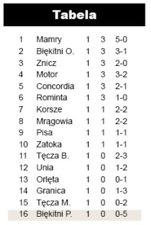 skuteczne rozegranie rzutu wolnego, kilkadziesiąt sekund później Brzozowski przepuścił strzał z dystansu i po niespełna kwadransie trzeba było już gonić wynik. Trzeba było, ale niewiele z tego wynikało. Jedyną w zasadzie groźną akcję pasymianie przeprowadzili w 30. min, gdy Malanowski otrzymał podanie z lewej strony, kiwnął obrońcę Mamr, lecz posłał piłkę minimalnie obok słupka. Co gorsza, gospodarze ani razu nie strzelili celnie na bramkę. Statystycy mogliby ewentualnie uznać za takie uderzenie wkręcające dośrodkowanie Alancewicza, do którego nikt z pasymian nie dotarł i giżycki bramkarz musiał złapać piłkę. W drugiej połowie obraz gry się nie zmienił – kolejne gole zdobyli przyjezdni, którzy przy jeszcze lepszej skuteczności mogli Błękitnych, mówiąc brutalnie, zdemolować. - To nie klasa okręgowa – komentowali po spotkaniu kibice, przypominając sobie, że pasymianie, nawet przy nie najlepszej grze, w poprzednim sezonie prawie zawsze sobie radzili. – Pierwsze śliwki robaczywki – pasymski burmistrz Cezary Łachmański, wierny kibic Błękitnych, używa typowego w podobnych sytuacjach stwierdzenia. – Lepszy zimny prysznic na początek niż na koniec.Skład Błękitnych (w podobnym zestawieniu pasymianie wystąpili tydzień wcześniej w pucharowym meczu z GKS-em Stawiguda), pokazuje, że po awansie do IV ligi w kadrze doszło do pewnych zmian. W drużynie pojawili się Paweł Alancewicz (wcześniej m.in. GKS Wikielec, Stomil Olsztyn), Filip Francuz (Tęcza Biskupiec), Paweł Dublanka (Błękitni Orneta), Bartosz Kurto (Stomil II Olsztyn) i Rafał Miara (rezerwowy bramkarz, Mrągowia Mrągowo). Na boisku co najmniej w najbliższym czasie nie zobaczymy braci Łukaszewskich oraz Michała Nosowicza. Cała trójka postanowiła zawiesić treningi.