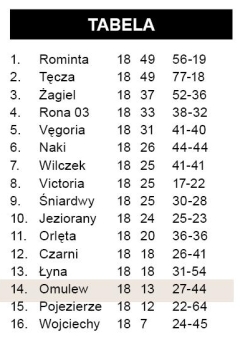 Cieszy go fakt, że piłkarze zrobili użytek z ćwiczeń wykonywanych dwa dni wcześniej - Trening piątkowy przenieśliśmy na mecz – słyszymy. Od początku spotkanie było toczone w szybkim tempie. W pierwszej połowie wielbarczanie wypracowali sobie bezpieczną przewagę, a po zmianie stron mogli kontrolować mecz. Przyjezdni próbowali się odgryzać, ale jednocześnie odkrywali się, co ułatwiało Omulwi wyprowadzanie kontrataków. Większość z nich, przeprowadzanych skrzydłami, zakończyła się zdobyciem bramek, a gdyby wielbarscy napastnicy zachowali parokrotnie zimną krew, byłoby ich jeszcze więcej. Goście grali do końca, czego efektem była bramka zdobyta już w doliczonym czasie gry. Zespół z podbartoszyckich Wojciech strzelił zresztą wcześniej najładniejszego gola meczu (na 3:1 dla Omulwi), gdy piłka po silnym uderzeniu zza pola karnego wylądowała w okienku. Do zespołu z Wielbarka wrócił – po jesiennym pobycie w Leśniku Nowe Ramuki – Daniel Włodkowski, który w niedzielę wbiegł na boisko w końcówce spotkania.