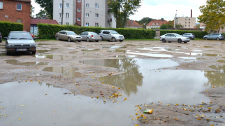 Mieszkańcy miasta, którzy nie chcą za wszelką cenę zostawiać swoich aut pod ratuszem na zatłoczonym placu, wybierają parking leżący tuż za bazą autobusową ZUK-u. Niestety, ostatnio, wskutek opadów plac przypomina raczej bajorko niż miejsce do parkowania samochodów.