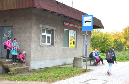 Na zdjęciu uchwyciliśmy scenkę, gdy akurat mocno nie padało. Mimo to dziewczynki chowają się pod daszek budyneczku pobliskiej placówki usługowej, choć mniej rozsądni chłopcy nadal siedzą na ławce, pod gołym niebem. Wydaje się, że miasto powinno w tym miejscu koniecznie postawić wiatę, która chroniłaby naszych milusińskich przed opadami deszczu, a w niedalekiej przyszłości także i śniegu.
