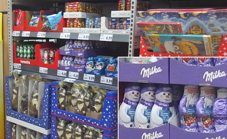 Już na początku października, czyli w zasadzie na trzy miesiące przed terminem w marketach spożywczych pojawiły się łakocie na Święta Bożego Narodzenia! Jak widać na zdjęciu, półki uginają się pod słodkim towarem - głównie czekoladowymi mikołajami (nowość: o smaku miętowym), a także śniegowymi bałwankami.