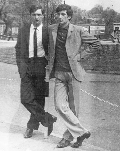 W okresie tym, to znaczy po powrocie z Gdańska, w domu miałem wikt i opierunek, parę groszy zaoszczędzonych mi zostało, którymi oszczędnie gospodarowałem. Ciuchy miałem modne i supereleganckie, też z Wybrzeża przywiezione - więc do moich codziennych obowiązków należało „szlifowanie chodników”, przegląd wystaw sklepowych, oglądanie się za zgrabnymi nogami i rozmowy z napotkanymi koleżankami i kolegami. Wszystko odbywało się na ul. Odrodzenia. Na niej skupiało się dzienne życie towarzyskie młodych mieszkańców. Moim serdecznym kolegą był od lat dziecięcych i nadal pozostaje Jurek Bryczkowski, który jest ode mnie o cztery lata starszy, ale do dnia dzisiejszego prezentuje się wspaniale. Popatrzcie na zdjęcie zrobione w lipcu 1967 roku, stoimy na początku ulicy Odrodzenia.Ja po lewej stronie miałem 21 lat, Jurek 25 lat.