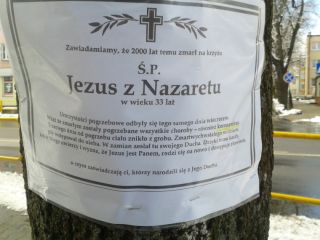 „Bóg umarł” – to zdanie, tłumaczone z Nietzschego również jako „Bóg nie żyje” („Gott ist tott”), interpretować można rozmaicie. Nie będziemy się tu zagłębiali w rozważania natury filozoficznej. Przypomnieliśmy ową myśl, odczytaną w sposób bardzo dosłowny, zatrzymując się nad nietypowym nekrologiem (fot. 6) umieszczonym na jednym z drzewek na ul. Odrodzenia- czyli tam, gdzie trochę wbrew przepisom, zawieszane są regularnie klepsydry. Treść raczej nie odnosi się do myśli Nietzschego – wystarczy się wczytać w dość nietypowy tekst, zawierający także nieoczekiwane odwołania do kwestii koronawirusa. Zastanawia trochę informacja o tym, że wszystko działo się 2000 (dokładnie?) lat temu. Nekrolog wywieszono ponadto przeszło tydzień przed przywoływaną rocznicą śmierci Jezusa na krzyżu, która przypada wszak w Wielki Piątek. Co ciekawe, nie znamy dokładnej daty dziennej owych wydarzeń – więcej, nie wiemy z całą pewnością, który to był rok – choć przyjmuje się 33.