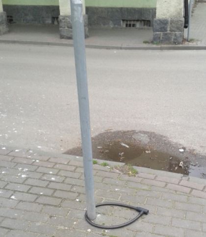 Przed tygodniem nasza redakcyjna koleżanka Grażynka pisała w swoim wspomnieniowym cyklu o perypetiach związanych z zaginięciem klucza do rowerowego zapięcia. Tam skończyło się na przecięciu linki – choć klucze oczywiście po czasie się znalazły. Nie tak dawno ktoś przypomniał sobie (lub wymyślił), jak odpiąć rower, który przez długie miesiące był przymocowany do łańcucha przy głównym szczycieńskim rondzie. Trochę inną scenkę „Kurek” zarejestrował ostatnio na skrzyżowaniu ulic Ogrodowej i 3 Maja. Niektórzy mają zwyczaj przypinania rowerów do znaków drogowych. Tu, jak widać, zostało tylko samo zapięcie (fot. 10). Roweru nie ma, a zapięcie przecięte raczej nie zostało. Teraz delikatna zagwozdka dla służb, jak się tego niepotrzebnego dodatku pozbyć.