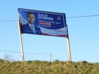 Od wyborów samorządowych minęło już prawie pół roku, do wyborów do Parlamentu Europejskiego zostało przeszło 50 dni, ale klimat wyborczy wciąż czuć w pewnym miejscu przy trasie Szczytno – Olsztyn. Uwagę osób podróżujących DK 53 zwraca od dłuższego czasu baner znajdujący się pomiędzy Leleszkami i Pasymiem (fot. 9). Wcześniej miał on charakter zachęcający do oddania głosu na kandydata startującego w wyborach do sejmiku, po pewnym czasie zmienił swoją formułę. Od paru miesięcy kandydat z okręgu nr 5 (giżycko-mrągowsko-nidzicko-pisko-szczycieńskiego), który w sejmiku ostatecznie nie zasiadł, dziękuje swoim wyborcom. Powyborcze wyrazy wdzięczności składało znacznie więcej kandydatów (częściowo także tych, którym szczęścia w głosowaniu zabrakło), widywaliśmy również tu i ówdzie podobne banery, ale dość szybko one znikły. Opisywany kandydat wynik uzyskał niezły, lepszy od paru kandydatów zasiadających w nowym sejmiku. Podał nawet ową liczbę głosujących: „Jest nas 4708”. Czas teraźniejszy w polityce bardzo szybko traci swoją ważność, a ilu faktycznie „ jest nas” – tego po paru miesiącach zwyczajnie określić się nie da. Może być – a raczej jest - więcej lub mniej. No tak, ale zdanie: „W październiku 2018 było nas 4708” brzmiałoby chyba zbyt nostalgicznie… Niełatwo jest być politykiem.