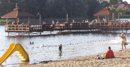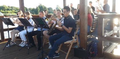Ciekawych pomysłów nigdy za wiele. Za koncept jak najbardziej trafiony należy uznać zorganizowanie występu niewielkiej orkiestry na szczycieńskim molo. Zespół SAKS, bo o nim mowa, postanowił muzycznie pożegnać lipiec. Audytorium zebrało się spore: niektórzy wsłuchiwali się w dźwięki z głową w trzcinach przypominających palmowe liście (fot. 3), zapełniły się ławeczki na molo, słuchacze skorzystali też z leżaków, które od bieżącego sezonu oferuje MOS (fot. 4). Muzykę bez problemu mogły usłyszeć osoby kąpiące się – mimo z lekka wieczornej już pory – w jeziorze czy znajdujące się na plaży (fot. 5).