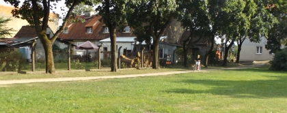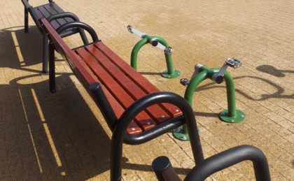 Rzeczony tor znajduje się praktycznie w centrum, tuż przy głównej drodze (fot. 8). Długość trasy przewyższa wyraźnie to, co było w Szczytnie, a nawierzchnia została pokryta masą bitumiczną. Osób korzystających akurat nie dostrzegliśmy – zdjęcie wykonaliśmy tuż po dość intensywnym deszczu. Skwerek uzupełniono m.in. ławeczkami, które można wykorzystywać jako siedziska swoistego roweru stacjonarnego (fot. 9) . Jak się dowiedzieliśmy, całość kosztowała około 250 tys. zł, z czego większość pokryło dofinansowanie. Wkrótce podobny pumptrack ma zostać zbudowany w Mrągowie – ten opisywany to pierwszy tego typu obiekt w tamtejszym powiecie.