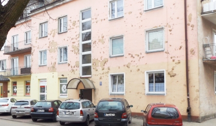 Na gruntowny remont pieniędzy pewnie nie ma, ale jakoś też nikt nie wpadł na pomysł, żeby postawić choćby jakąś tabliczkę ostrzegawczą w stylu spotykanego w górach znaku A-25 „spadające odłamki skalne”. Bo przecież „jakoś to będzie” i co już miało spaść, to spadło. Nieco inny problem pojawia się na kamienicy znajdującej się skrzyżowaniu ulic Odrodzenia i 3 Maja. Tutaj tynk na przechodniów nie spada, grozić może jedynie… kontakt z latającymi płatami farby. Czy to kwestia niewłaściwego przygotowania podłoża, czy niewłaściwej jakości farby – trudno tego dociec. Budynek, leżący podobnie jak wcześniej opisywane w centrum miasta, wygląda specyficznie i mieszkańców swoją prezencją raczej nie cieszy (fot. 13).{/akeebasubs}
