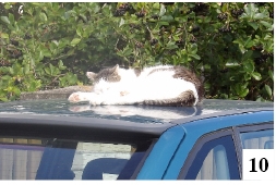 W ostatnich dniach zrobiło się zdecydowanie cieplej, momentami wręcz gorąco. Na plaże wrócili miłośnicy opalania, zachęceni intensywniejszym słońcem niż na początku miesiąca. Wbrew słyszanym często opiniom dotyczącym drożyzny na Mazurach, małej atrakcyjności lokali itp. turystów na naszych terenach nie brakuje. Przyciąga, nawet na krótko, choćby Szczytno wraz z okolicznymi jeziorami, kempingami, domkami itd. Gdy w niedzielne popołudnie, chwilami akurat dość pochmurne, zrobiliśmy mały rekonesans kawałek za granicami naszego powiatu, odwiedzając okolice Rucianego-Nidy, widzieliśmy całe sznury samochodów nawet na bocznych drogach, tłumy turystów w Ukcie, Krzyżach nad Jez. Nidzkim, a zaparkowanie pojazdu w Rucianem nie należało do łatwych zadań (fot. 9) . Dość ciasno, co w niedzielne popołudnia nie jest regułą, było i w naszym Szczytnie. Ale kto powiedział, że korzystanie ze słonecznej i ciepłej aury to domena tylko ludzi? Koty uwielbiają np. nasłonecznione dachy, a dodajmy, że nie muszą to być wyłącznie dachy garaży czy innych niewysokich budynków (fot. 10).