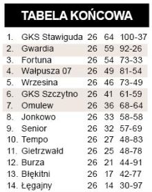 - W pierwszej połowie gra była naprawdę niezła – mówi trener Gwardii Mariusz Korczakowski. – Potem uszło z nas powietrze. Po przerwie rywal grał zresztą lepiej. Sztab Gwardii śledził na bieżąco wynik meczu lidera ze Stawigudy i przekazywał informacje zawodnikom. Spotkanie we Wrzesinie rozpoczęło się z 20-minutowym opóźnieniem spowodowanym problemami z odpowiednim umocowaniem bramki. Wynik meczu w Zabielach nie dodał szczytnianom skrzydeł. W końcówce stracili oni dwie bramki. – Nie jesteśmy na straconej pozycji – szkoleniowiec Gwardii odnosi się do gier barażowych (piszemy o nich trochę dalej). W co najmniej jednym meczu trener Korczakowski zasiądzie na trybunach – sędzia pokazał mu w dość kuriozalnych okolicznościach czerwoną kartkę.