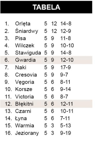zdobyli bramkę kontaktową po dośrodkowaniu z rzutu wolnego. Na krótko zrobiło się nerwowo – w wielkim zamieszaniu pod bramką Gwardii piłka trafiła w poprzeczkę. Sytuację uspokoił Balcerzak, który bezbłędnie wykończył kontrę przeprowadzoną lewym skrzydłem. W samej końcówce szczytnianie mogli zupełnie dobić rywali, lecz wynik już się nie zmienił. – Fortuna była po naszej stronie. Gdyby padł gol na 2:2, mogło być różnie – przyznaje trener Mariusz Korczakowski. - Vęgoria dobrze operowała piłką i trochę nas przycisnęła. Uważam jednak, że wygraliśmy zasłużenie. Zespół musi teraz zmobilizować się na wyjazdowy mecz z Victorią – najprawdopodobniej z różnych przyczyn w składzie Gwardii zabraknie kilku kluczowych zawodników.