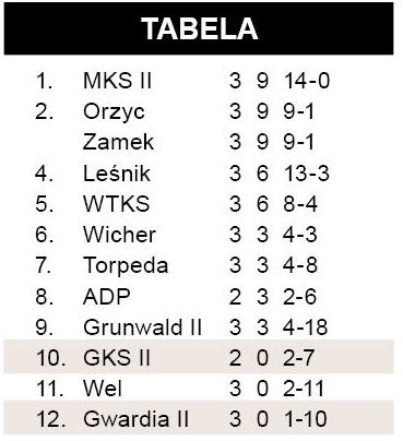 GKS II: Marciniak, Szymański (69. D. Osowiecki), P. Gromadzki, Szydlik (61. Kiernozek), Deptuła, K. Gromadzki, K. Osowiecki, Czaplicki, D. Kozicki (55. R. Kozicki), Tabaka, Sz. Kozicki (82. Majewski).