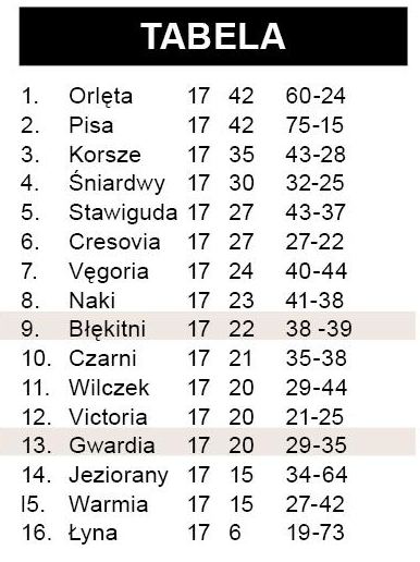 Pisa Barczewo, prowadząca przed minioną kolejką, po raz ostatni przegrała w sierpniu. Od tego momentu zaliczyła serię dwunastu zwycięstw. Zastopowana została przez Gwardię, która niemal pół meczu musiała grać w dziesięciu.