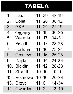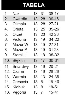 Trwa seria zwycięstw Gwardii Szczytno. Po kolejnej wygranej podopieczni Kamila Kwiatka awansowali na drugie miejsce w tabeli. Znacznie gorzej w tym sezonie idzie Błękitnym Pasym, którzy wygrywają tylko co pewien czas. W najbliższy weekend, z powodu przypadających na sobotę i niedzielę Wszystkich Świętych oraz Dnia Zadusznego ligowe mecze nie zostaną rozegrane.