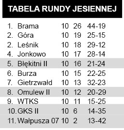 W klasie B mieliśmy nieudaną sobotę i znacznie lepszą niedzielę. Prawdziwym pogromem zakończył się wyjazdowy mecz rezerw GKS-u. Bardziej wyrównaną walkę toczyły drugie drużyny Perkuna i Omulwi, ale i one wróciły bez punktów. Największą niespodziankę sprawiła Wałpusza. Wprawdzie Brama Olsztyn to ligowy debiutant, ale zespół ze stolicy województwa zdominował rozgrywki i jest głównym kandydatem do awansu. Gospodarze prowadzili już 3:1, jednak autsajder rzutem na taśmę urwał punkty liderowi. Swój dorobek powiększyły rezerwy Błękitnych, czyli nasz najlepszy jesienią B-klasowy zespół. Teraz przed drużynami przerwa zimowa.