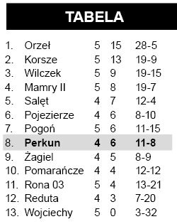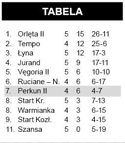 W klasie B na pochwałę zasługują tylko rezerwy GKS-u, które po emocjonującym meczu pokonały mocną w ubiegłym sezonie drużynę z Mierek. Ozdobą tego meczu toczonego w deszczu była ostatnia bramka zdobyta przez Antoniego Sokołowskiego lobem. Atutu własnego boiska nie wykorzystał drugi zespół Perkuna, który uległ zdecydowanie drużynie mającej ogranie w wyższych klasach.. Kolejną wysoką porażkę zanotowała Wałpusza. Zespół z Jesionowca trzymał się jako tako do końcówki pierwszej połowy, ale potem worek z bramkami się rozwiązał. Dla gospodarzy były to pierwsze punkty w sezonie.