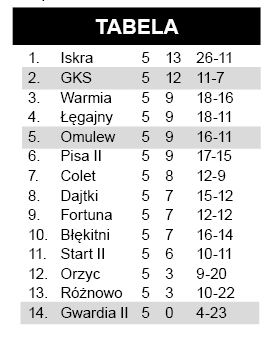 Leśnik Nowe Ramuki – Brama Olsztyn 0:3, Góra Idzbark – Burza Slupy 1:0. Pauzowała Omulew II Wielbark.{/akeebasubs}