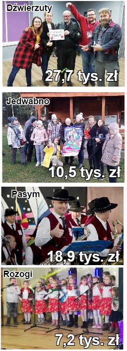 Wiele działo się też w mniejszych miejscowościach powiatu. Najwięcej spośród gmin zebrały Dźwierzuty – 27,7 tys. złotych. Tu wielkie granie trwało kilka dni i rozpoczęło się jeszcze przed finałem. W programie był m.in. mecz piłki nożnej samorządowcy kontra strażacy, a w gminnych instytucjach oraz placówkach oświatowych przeprowadzono zbiórki do puszek. Koordynujący akcję dźwierzucki GOK uzbierał na licytację pokaźną liczbę przeróżnych przedmiotów oraz voucherów na usługi. Wśród wystawionych na aukcję rzeczy znalazł się również apetycznie wyglądający tort.