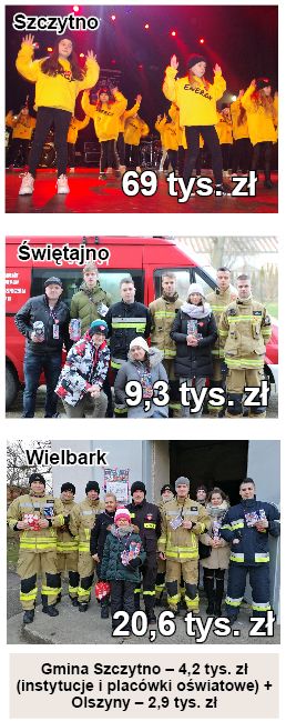 Niedzielny, 28. finał Wielkiej Orkiestry Świątecznej Pomocy przyniósł kolejny rekord. Dwa działające w powiecie sztaby, wielbarski i szczycieński, zebrały w sumie prawie 170 tys. złotych. W samym tylko Szczytnie, do puszek wolontariuszy oraz z licytacji zebrano blisko 70 tys. złotych. Spośród gmin powiatu najlepsze były Dźwierzuty. Mieszkańcy tej gminy zasilili orkiestrowe konto kwotą prawie 28 tys. złotych.