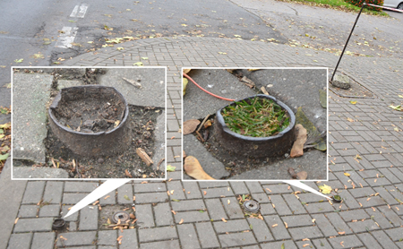 Następnego dnia pręt i kamień jednak zniknęły – studzienka otrzymała nową pokrywę. Dodajmy jeszcze, że kiedy oglądaliśmy miejsce jeden z przechodniów ostrzegł nas przed „potykaczami”. Przy czym nie chodziło o chodnikowe reklamy-stojaki, a metalowe rurki wystające z chodnika.