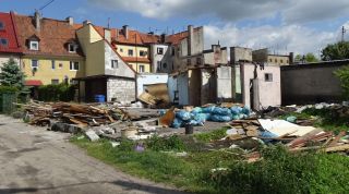Jeśli na opisywanym skrzyżowaniu skręcimy w drugą stronę, zobaczymy już tylko żałosne resztki przeszłości po innym budynku. W epoce słusznie minionej miłośnicy trunków wszelakich mieli w nim swój niemal westernowy z ducha saloon nazywany z lekka upiornie „Trupkiem”. Działy się tu rzeczy rozmaite, ale, jak się dowiedzieliśmy, w kryzysowych latach 80. można było w tym miejscu kupić np. pomarańcze, czyli w tamtych czasach – rarytas. „Trupek” jako lokal nie wytrzymał zderzenia z trochę późniejszą rzeczywistością, przerobiono go m.in. w hurtownię owocowo-warzywną. W ostatnich tygodniach niezbyt imponujący architektonicznie obiekt zaczęto rozbierać – zdążyliśmy jednak uwiecznić to i owo (fot. 10 – widok od strony rynku).