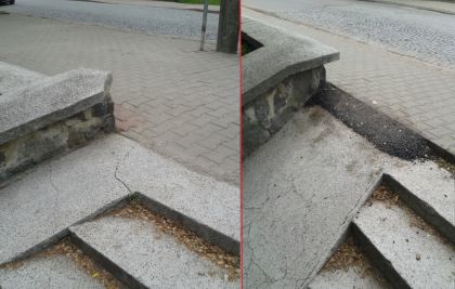 Kilka razy przymierzaliśmy się do napisania o nadjeziornych zejściu, które nie najlepiej komponuje się z chodnikiem na granicy ulic Sienkiewicza i Mickiewicza. Oprócz schodków znajduje się tu zjazd dla np. wózków. Z jakichś dziwnych powodów nie pomyślano o tym, by zjazd zaczynał się na jednym poziomie z chodnikiem – podzielone to było uskokiem. Podczas niedawnego spaceru zauważyliśmy, że ktoś wpadł na pomysł, by niedoróbkę uzupełnić… asfaltem. No i mamy teraz jedną nawierzchnię na zejściu, polbruk na chodniku, kostkę granitową dla samochodów i do tego jeszcze fragmencik asfaltu. Co ciekawe, wcześniejsze zejście na ścieżkę, zostało zgrane z chodnikiem – ten drugi na krótkim odcinku odpowiednio wyprofilowano. Popatrzmy, jak to wygląda na zdjęciu nr 11.