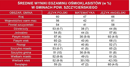 Na tle słabego wyniku województwa jeszcze słabiej wypadł powiat szczycieński. Do wyjątków należą placówki, gdzie średnia przewyższała, bądź była równa średniej krajowej.{akeebasubs !*}