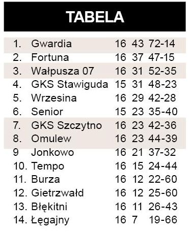 Wałpusza nie może znaleźć recepty na Gwardię. Podopieczni Cezarego Kucińskiego radzą sobie z innymi czołowymi zespołami klasy A, ale w starciu z drużyną ze Szczytna dwa razy byli bez szans. W meczu z poprzedniej rundy praktycznie nie podjęli walki, teraz mecz ustawiła bramka zdobyta szybko przez Magnuszewskiego. Gdy w 55. czerwoną kartkę przy stanie 0:3 otrzymał D. Lech, stało się jasne, że rozmiary porażki mogą się zmienić tylko na niekorzyść. I faktycznie, kilka minut później do bramki trafił niezawodny w ostatnich meczach Gwardii Wnuk. Gdyby nie kilka udanych interwencji Sygnowskiego, zwycięstwo lidera byłoby jeszcze wyższe.