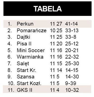 Perkun zdeklasował rezerwy GKS-u w swoim sierpniowym powrocie do klasy B. Teraz zwycięstwo nie było aż tak okazałe, ale nie pozostawiało wątpliwości, kto jest lepszy szczególnie w drugiej połowie. Gospodarze szybko objęli prowadzenie po dobrze rozegranym rzucie rożnym, jednak potem sytuacje podbramkowe tworzyli głównie goście. Bohaterem meczu został debiutujący w Perkunie Bartosz Laskowski, autor trzech bramek. W poprzednim sezonie grał w… GKS-ie Szczytno. Lider przed świętami pauzował, Perkun zasiadł zatem na fotelu przodownika, na którym już był w poprzedniej rundzie.