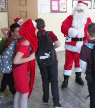 Mikołajkowo było nie tylko w poszczególnych salach, ale i na szkolnych korytarzach. W szczycieńskiej Szkole Podstawowej nr 2 przechadzał się po nich przez cały dzień mikołaj (fot. 11), dzwoniąc dzwoneczkiem i chętnie rozmawiając z dziatwą.