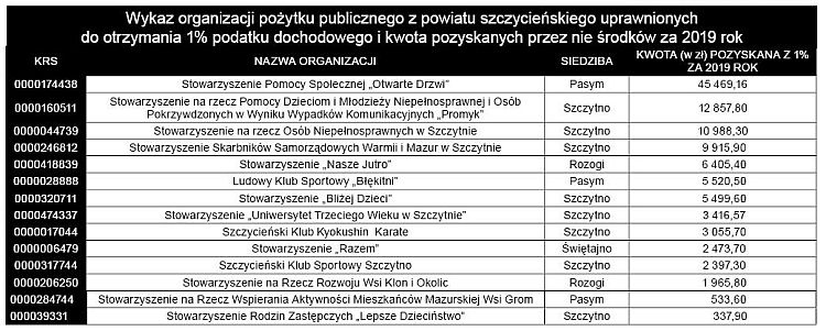 Mieszkańcy powiatu szczycieńskiego coraz chętniej przekazują 1% podatku organizacjom pożytku publicznego. Po raz pierwszy w historii zdecydowała się na to ponad połowa podatników, przekazując na szlachetny cel 940 tys. zł. Zarejestrowane na naszym terenie stowarzyszenia pozyskały z tego niewielką część, bo ok. 111 tys. zł.