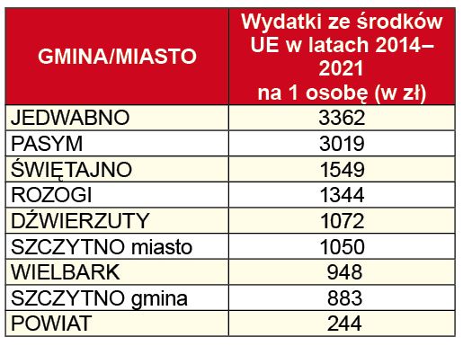 75 proc. wszystkich dotacji z funduszy unijnych zostało przeznaczonych na inwestycje bardzo ważne dla lokalnych społeczności, takie jak oczyszczalnie ścieków, sieci wodociągowe i kanalizacyjne czy drogi. W gronie samorządów z powiatu szczycieńskiego bezapelacyjnymi liderami są gminy Jedwabno i Pasym, które mogą pochwalić się przekroczeniem 3 tys. zł. Daleko w tyle są pozostałe samorządy z kwotami dwu, a nawet ponadtrzykrotnie niższymi.