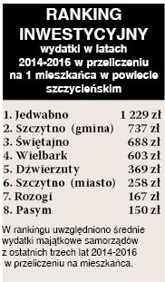 Gmina Jedwabno wciąż utrzymuje się na czele rankingu inwestycyjnego. To ona w powiecie szczycieńskim przekazuje najwięcej środków na inwestycje w przeliczeniu na jednego mieszkańca. Bardzo słabo pod tym względem wypada miasto Szczytno, a najgorzej Pasym.