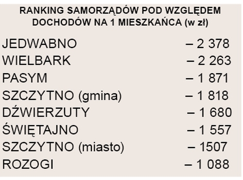 Średni wskaźnik dla całego kraju wynosi 2 122 zł na mieszkańca. Poniżej tej średniej znalazło się aż 2037 na 2477 gmin w Polsce. W tym gronie jest większość samorządów miejskich i gminnych z powiatu szczycieńskiego. Wynik powyżej średniej odnotowały tylko Jedwabno – 2378 zł i Wielbark – 2263.