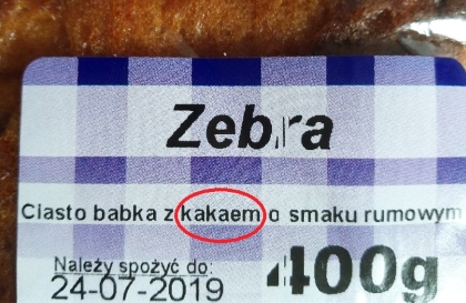Mamy trzy odmiany kakao, o prostych do zapamiętania nazwach: criollo, forastero i tinitario. Jak wspomnieliśmy, odmian kakao znamy kilka, ale jako wyraz jest ono nieodmienne – po prostu słowo to ma budowę odrobinę niedopasowaną do naszego języka. Nic na to nie poradzimy – musimy używać konsekwentnie jedynej formy – „kakao”. Niektórych jednak korci, by mówić i pisać, że ktoś np. nie lubi kakaa (kakała?). Podobne gramatyczne pokusy pracowników pewnej cukierni odkryła nasza Czytelniczka, pani Paulina, która kupiła w jednym ze szczycieńskim sklepów zebrę. Mówimy tu oczywiście nie o egzotycznym zwierzęciu, tylko o cieście, którego upiec bez sporej dawki kakao się nie da (fot. 8). Językoznawcy dopuszczają wprawdzie częściowe odmienianie owego słowa w mowie potocznej (takie „w kakale” jest już jednak lekkim absurdem, bo skąd to „l”), ale na etykietach obowiązują raczej zasady etykiety językowej…