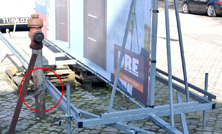 Przy centrum handlowym wybudowanym niedawno przy ul. Chrobrego hydrant posłużył jako słupek podtrzymujący ostrzegawczą taśmę, która zagradzała wjazd na parking. Jakiś czas temu stawiano tam mały tymczasowy pawilon handlowy. Niestety, wykonawcom tej budowli zabrakło chyba już sił na zdemontowanie taśmy. Do dziś, a mija już miesiąc, rzecz przywiązana jednym końcem do hydrantu wije się jak wąż na trawniku przyległym do parkingowej zatoczki. W innym miejscu uliczny hydrant znalazł jeszcze inne zastosowanie. Zabezpiecza niczym policjant, czy też stróż pewną reklamę. Kołowa platforma, na której została ona zamocowana jest przytroczona grubym łańcuchem właśnie do hydrantu. Nikt jej teraz nie ruszy, chyba że razem z tym wodnym urządzeniem.
