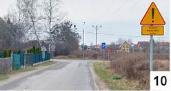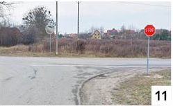 Gdy ostatnio poruszaliśmy się wąską asfaltówką łączącą Leśny Dwór z ulicą Leśną, dostrzegliśmy kilka nowych znaków (fot. 10). Jeśli dobrze pamiętamy, wcześniej było to skrzyżowanie dróg równorzędnych, czyli także, na którym obowiązuje pierwszeństwo prawej strony. Teraz teoretycznie też tak zostało - co najmniej z perspektywy jazdy ulicą Leśną, zarówno od strony centrum Szczytna, jak i lasu. Tam nie zobaczymy znaku informującego o poruszaniu się drogą z pierwszeństwem przejazdu. Ową zmianę organizacji widać konkretnie tuż przed wjazdem w ulicę Leśną, gdzie w pewnym oddaleniu od krawędzi jezdni ustawiono odpowiedni znak (fot. 11) . Tu kierowcy nie do końca widzą, co dzieje się z lewej strony, ponieważ utrudnieniem jest ustawione blisko drogi ogrodzenie (choć ułatwieniem jest lustro). Podobny problem mają kierowcy poruszający się od strony lasu. Ci, jeśli chcą jechać prosto, powinni przepuścić samochody poruszające się drogą z Leśnego Dworu. No, ale te pojazdy muszą się zgodnie ze znakiem zatrzymać i wychodzi zamieszanie. Naszym skromnym zdaniem nowa organizacja sytuację na tym skrzyżowaniu nie do końca poprawiła.