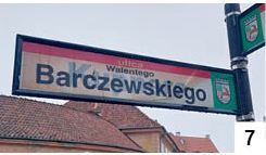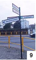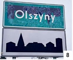 Jakie procedury obowiązują podczas wytwarzania drogowych tablic? Pewnie jakoweś są, ale nigdy się taką produkcją nie paraliśmy. Sformułowanie "po kosztach" trafnie odnosi się do kilku tablic, które ostatnio widzieliśmy. Jeden z przykładów to oznakowanie ulicy Barczewskiego w Szczytnie. Jak widać na fot. 7, na tablicy wcześniej musiało być coś innego, ale tego nie usunięto. Jeszcze inaczej wygląda tło na dwóch tablicach w Olszynach. Oznakowanie takie znajduje się przy gruntowej drodze prowadzącej na północ od tej miejscowości. Zarówno przy wjeździe, jak i przy wyjeździe ujrzymy znak z odbitą do góry nogami dodatkowo odwróconą w poziomie grafiką odnoszącą się do obszaru zabudowanego (fot. 8) . Jak chyba kojarzymy, tło tego typu tablic jest białe.