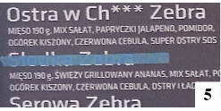 Do konsumpcji potraw przyrządzanych w foodtruckach zachęcały egzotycznie brzmiące nazwy, niekiedy spolszczone w nie do końca chyba poprawny sposób. Ceny, choć promocyjne raczej nie były, nie straszyły jak „paragony grozy” znad morza. Ostatecznie należało wyłożyć jednak co najmniej paręnaście złotych, by rozkoszować się kilkoma kęsami lub łykami tego czy owego. Naszą uwagę wśród dań zwróciło to, którego nazwę uwieczniliśmy na fot. 5.