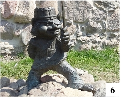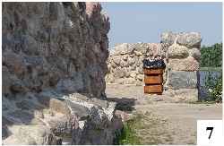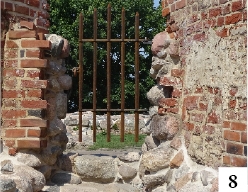 Do ruin wrócił zdemontowany jakiś czas temu Jurand, czyli pofajdok z zasłoniętym okiem (fot. 6) . Jeszcze wcześniej pojawiły się kosze na śmieci (fot. 7) . Niestety, nie wszyscy zwiedzający je dostrzegają… Zakratowano także wyjście z wnętrza ruin na taras z widokiem na plażę i jezioro (fot. 8) . Przy wejściu głównym od strony dziedzińca ratuszowego zamontowano bramę – to znak, że jeśli zajdzie potrzeba, ruiny będą np. na noc zamykane. Nad zachowaniem pewnych mocno nieodpowiedzialnych osób zapanować inaczej się nie da – odnowiony za kilkanaście milionów obiekt nie jest w końcu od nocnego spożywania alkoholu i załatwiania potrzeb fizjologicznych…