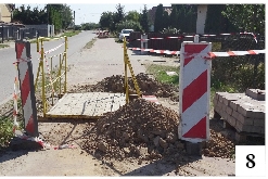 Brakuje porządku na ścieżce pomiędzy Kamionkiem i Szczycionkiem, brakuje go także w samym Kamionku. Tu szlak pieszo-rowerowy biegnie po drugiej stronie drogi. W wielu miejscach jest zapiaszczony lub zasypany spadającymi z drzew owocami. Na wysokości bloków pozostaje w zasadzie nieprzejezdny – ale z innego powodu. Od niedawna w Kamionku prowadzone są roboty ziemne. Zgodnie ze stojącymi od lat znakami rowerzyści powinni korzystać tylko ze ścieżki. Ta jest jednak w paru miejscach zablokowana (fot. 7) lub przejazd przez kładkę staje się lekko ryzykowny (fot. 8). Ktoś powie, że można przecież wjechać na drogę, ale zabrania tego wspomniany wcześniej znak. Problem mają i piesi. Na opisywanym odcinku nie ustawiono tabliczki nakazującej poruszanie się drugą stroną chodnika – a takowa istnieje, choć bez pasa dla rowerzystów.