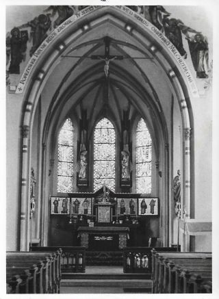 Kościół wzniesiony został z czerwonej cegły w stylu neogotyckim. Witraże wykonano w zakładzie Schneidera w Regensburgu. Zarówno witraże, ołtarz główny oraz dekoracja malarska łuku tęczowego zaprojektowane zostały przez wikariusza katedralnego Georga Denglera z Regensburga.