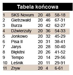 - Emocje opadły już w poprzedniej kolejce. Gospodarze chyba tylko chcieli rozegrać mecz i nic więcej – kwituje ostatni ligowy pojedynek trener Błękitnych Daniel Włodkowski. Goście kontrolowali przebieg spotkania i odnieśli przekonujące zwycięstwo. Wygląda na to, że sezonem zmęczona jest co najmniej część pasymskiej ekipy, radzącej sobie skądinąd bardzo dobrze. Na treningach pojawiało się w ostatnich tygodniach zaledwie 7 graczy, a na mecz zamykający rozgrywki pojechało tylko 12 zawodników.